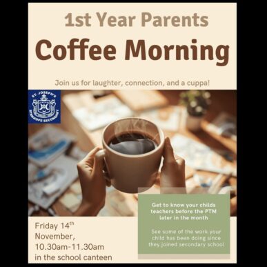 Dear 1st Year Parents/Guardians, We are delighted to again be hosting our annual coffee morning for 1st year families....
